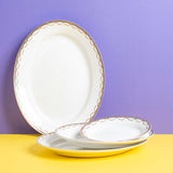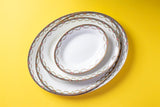 Cream china with a very fine border of black and white and gold with glarlands of pink and green flowers, very pretty!