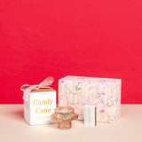 A little Christmas Candy wrapped in one of our floral gift boxes with red tissue and a sprig of Christmas follaige.