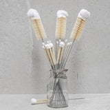 Constructed from natural materials, our bottle brush boasts unparalleled durability compared to its synthetic counterparts. With a wire stem, this brush can easily be hung after use. The white cotton wool tip allows for precise cleaning of vases, bottles, champagne flutes, and ideal for reaching the bottom of narrow vases, children's drink bottles, and delicate items.