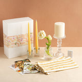 Perfect for creating memorable moments at home or as a complete gift for couples setting up their first home together. This collection combines lemon yellow candles with soft ivory accents and striped linens for a timeless tablescape designed for two.